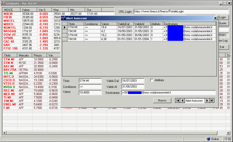 (*) Per l'invio degli alert via SMS utilizzo il servizio gratuito di Vodafone-Omnitel. Il servizio viene erogato inviando una mail al server sms.vodafoneomnitel.it.